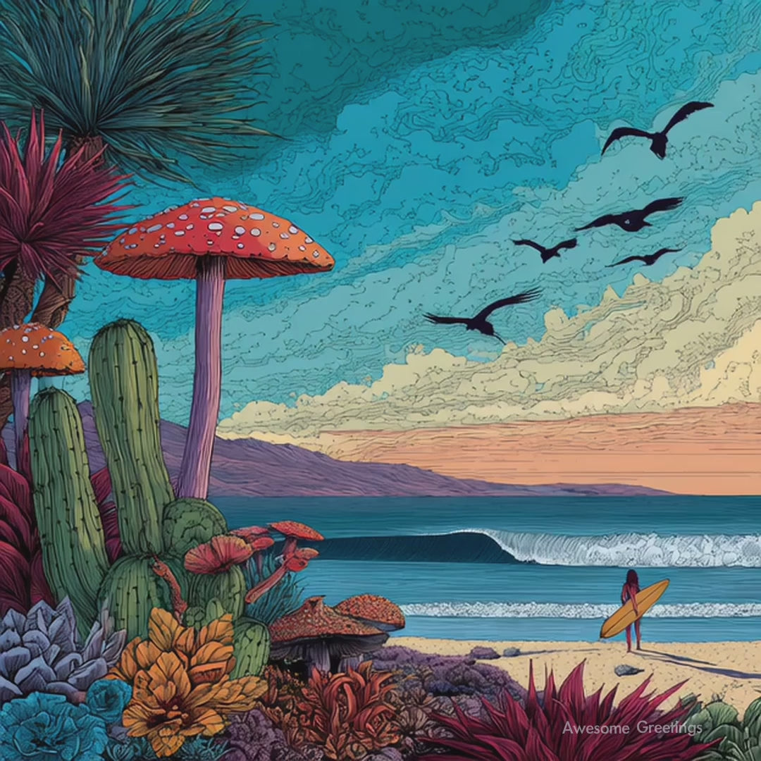 Perfect for beach lovers, surfers, desert dreamers, or anyone who appreciates unique, artistic birthday vibes.