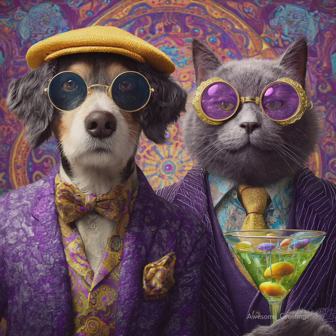 This stylish animated greeting card features a sharply dressed dog and cat duo in retro suits and round shades, raising a toast in a vibrant psychedelic lounge scene. With rich colors, smooth motion, and a playful yet classy aesthetic, this card brings cool confidence and celebratory energy to any occasion.