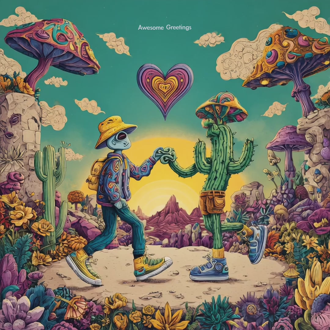 Celebrate love and friendship with this vibrant desert-inspired birthday animation. Featuring a colorful traveler and a playful cactus exchanging a glowing heart, this scene blends psychedelic art, warm sunset tones, and joyful motion.